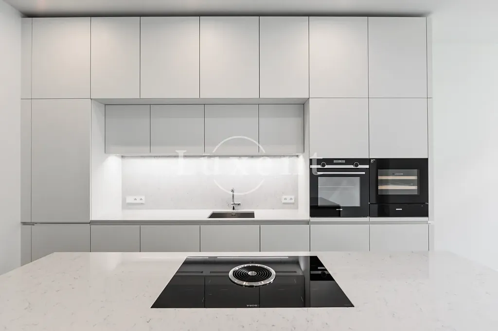 Dispozice nabízí vstupní chodbu, koupelnu se sprchovým koutem, toaletou a bidetem, master ložnici s en suite koupelnou s vanou a toaletou, další dvě neprůchozí ložnice, z nichž jedna disponuje balkónem a prostorný obývací pokoj s kuchyňským koutem vybaveným všemi spotřebiči – indukční varnou deskou, digestoří, horkovzdušnou troubou, myčkou, lednicí s mrazákem a vinotékou. Součástí vybavení je i pračka se sušičkou.
