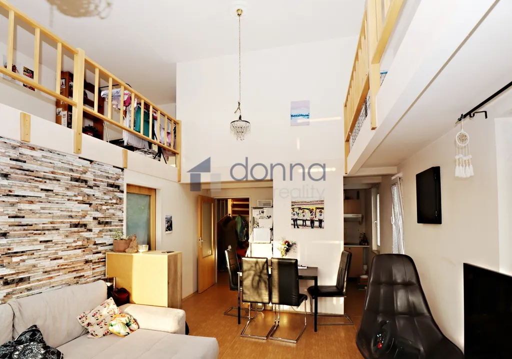 Byt se nabízí bez nábytku, ve spodní části bytu se nachází vstupní předsíň a obývací pokoj s kuchyňským koutem, který je vybavený varnou deskou a digestoří. Dále je zde ložnice, koupelna s vanou a samostatná toaleta. V horním patře je další pokoj a prostorná galerie.