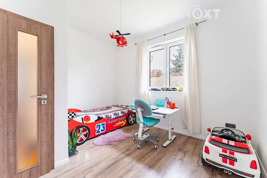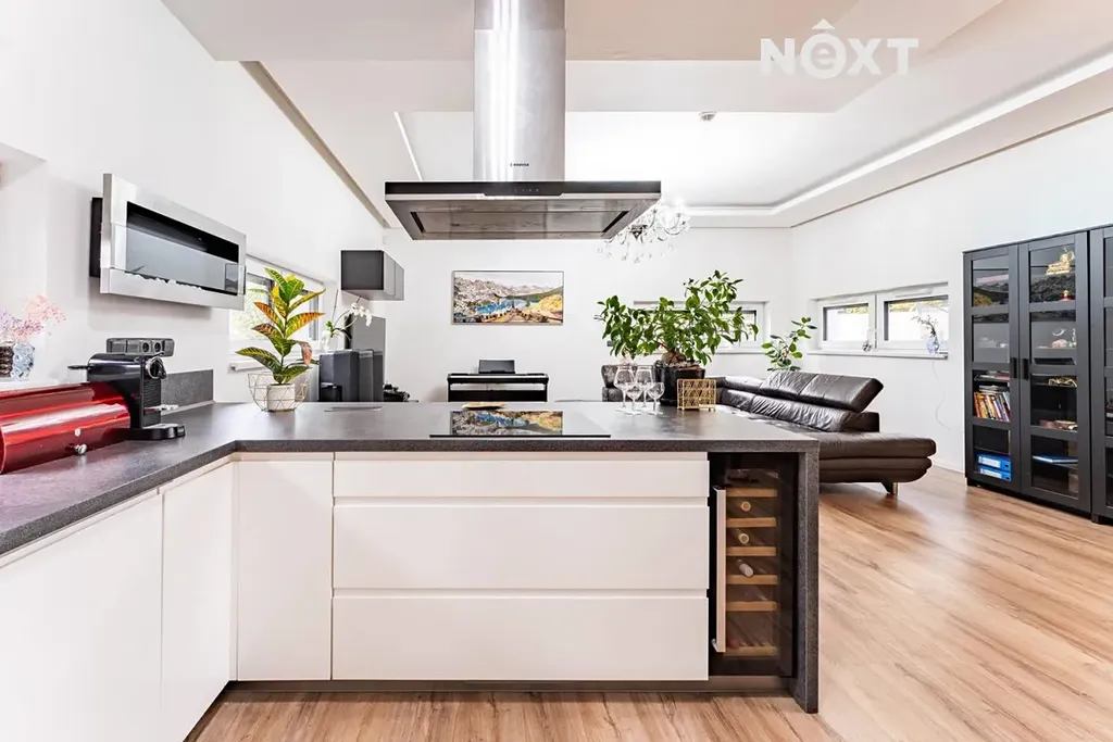 Dům nabízí dispoziční řešení 4+kk s prostorným obývacím pokojem, který díky netradičně vysokým stropům (3,2 m) působí mimořádně vzdušně a velkoryse. Na něj navazuje moderní kuchyně s jídelní částí, odkud je přímý vstup na terasu o velikosti 26 m² a zahradu s jihozápadní orientací. Kuchyňská linka je vyrobena na míru, vybavena vestavěnými spotřebiči a navržena tak, aby poskytovala maximum pracovního i úložného prostoru. Součástí domu je místnost pro šatnu, samostatná toaleta pro hosty, technická místnost s pračkou, sušičkou a bojlerem. Koupelna s vanou i sprchovým koutem a další toaletou, tři neprůchozí pokoje a garáž o ploše 25 m² s automatickými vraty.