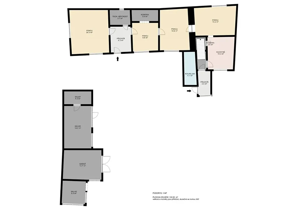 Hlavní objekt nabízí celkovou užitnou plochu cca 257 m rozdělených do dvou podlaží.