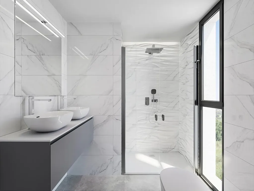 • Koupelny se závěsnými umyvadly, zrcadlem, sprchovým koutem od zdi ke zdi a skleněnou zástěnou
