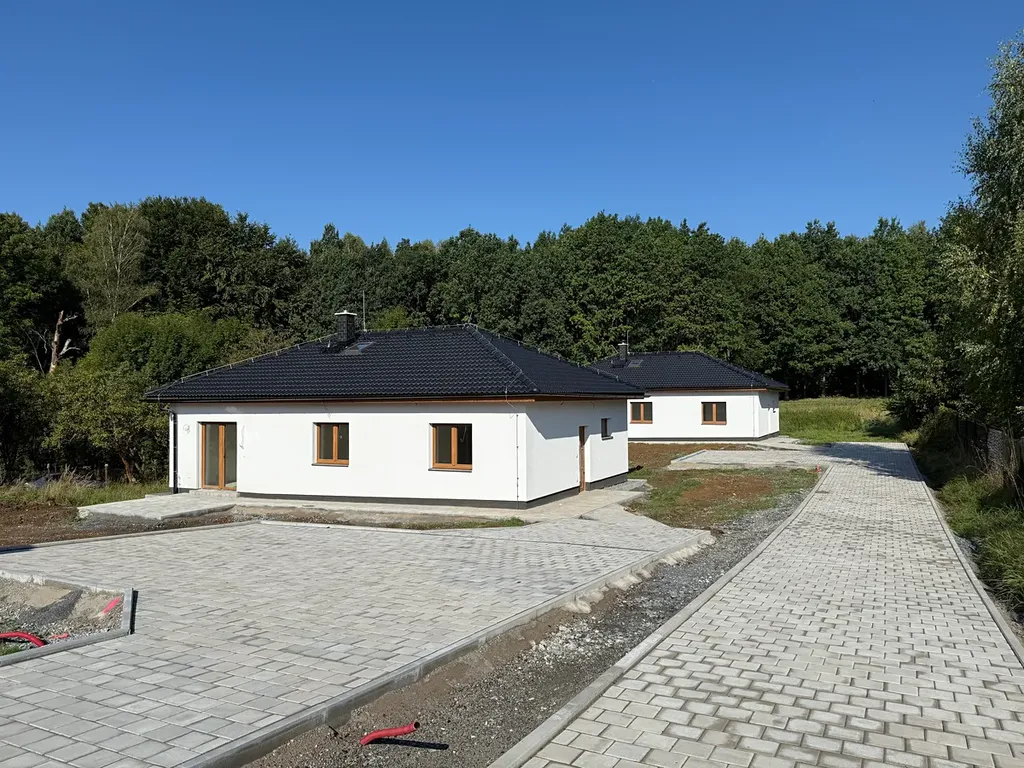 Dům nabízí 86 m2 užitné plochy, energetický štítek ,,B,,. Venkovní terasa, stání pro 2 automobily, příjezd. Vše ze zámkové dlažby.