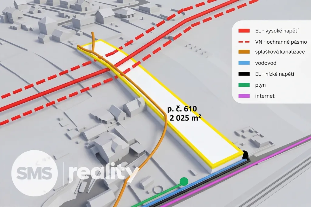 Elektřina: Připravena – na pozemku už stojí elektrický pilíř („antoníček“), podzemní vedení NN je na jižní hranici.