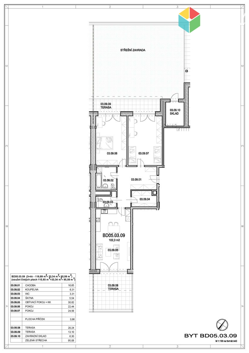 Plocha bytu je rozvržena velmi prakticky, v bytě je prostorná chodba, samozřejmostí je šatna, koupelna s toaletou i druhý samostatný záchod. Obě ložnice jsou velmi světlé, s velkými francouzskými okny, mají vstup na terasu. Na druhou terasu je přístup z obývacího pokoje.