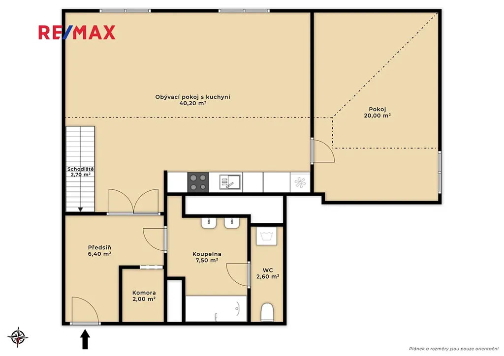 Součástí tohoto podlaží je také samostatný pokoj, koupelna a WC. Obojí prošlo kompletní rekonstrukcí na konci roku 2025, stejně jako vstupní chodba.