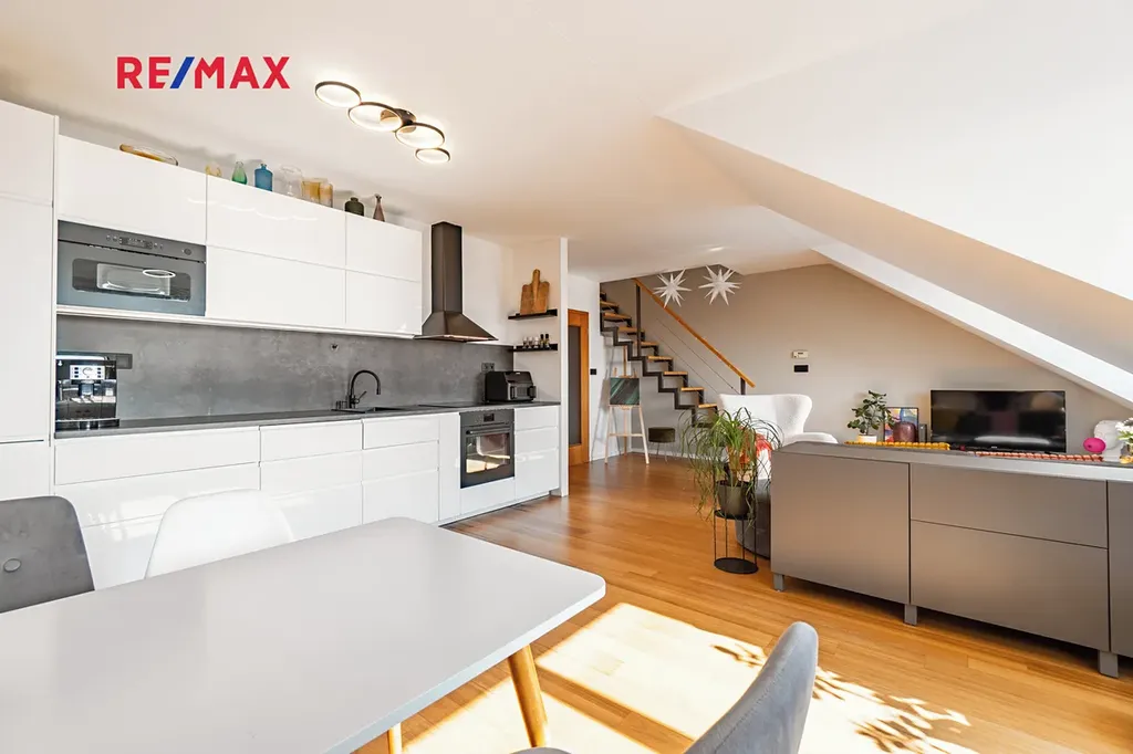 Byt se nachází v 7. a 8. nadzemním podlaží domu s výtahem a je řešen jako mezonet, což mu dává vzdušnost a přirozené rozdělení jednotlivých zón.