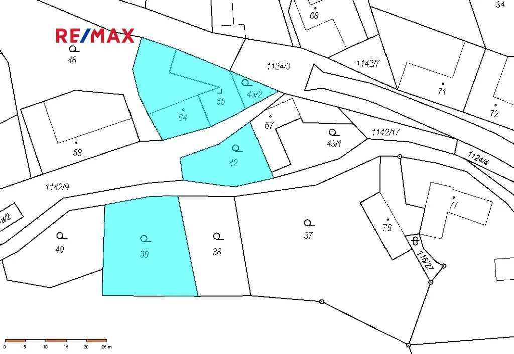 Pozemky se sestávají z pěti parcel, z toho 3 parcely jsou uceleného celku o výměře 482 m2 a naproti jsou 2 pozemky - zahrady o výměře 662 m2.
