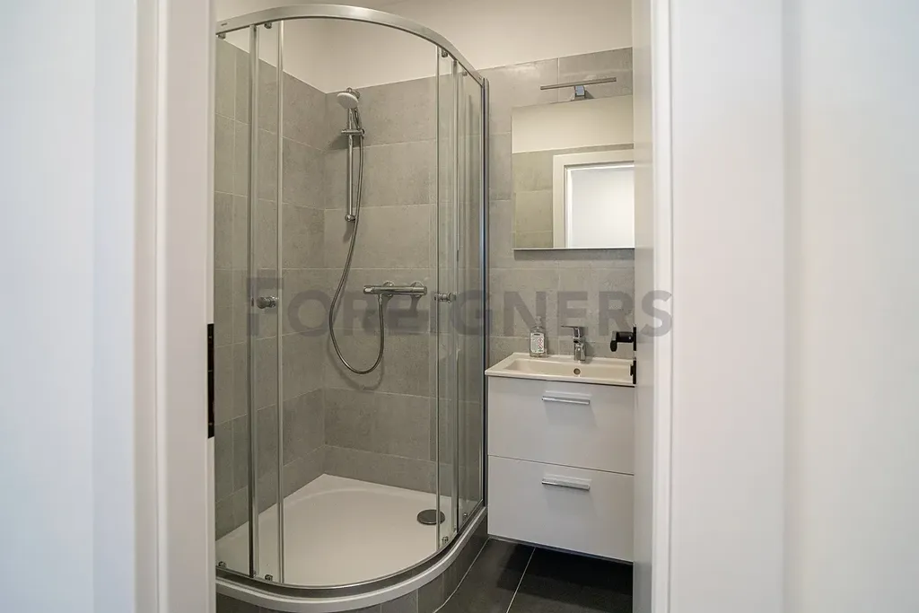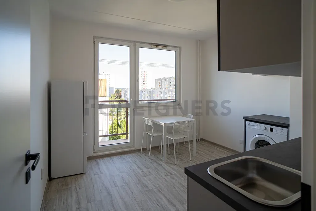 Pokoj se nachází v plně vybaveném, moderním bytě. V pokoji je umístěna postel s matrací, komoda, psací stůl se židlí a věšák na oblečení. Kuchyně je vybavena moderními spotřebiči - myčkou na nádobí, pračkou, elektrickou troubou, mikrovlnnou troubou a indukční deskou. Součástí vybavení jsou také základní příbory, talíře a hrnky. V kuchyni je také umístěna lednice s mrazákem a jídelní stůl se 4 židlemi. V koupelně je umístěn sprchový kout, umyvadlo se skříňkou a zrcadlo. V hlavní chodbě je umístěna sdílená šatní skříň a věšák na kabáty s botníkem.