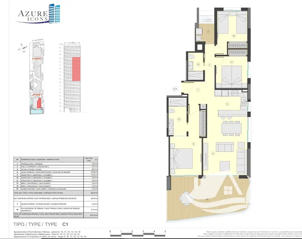 Apartmán o celkové ploše 125,76 m² a užitné ploše 94,56 m² je navržen s důrazem na funkčnost a komfort. Dominantou je prostorný obývací pokoj s kuchyní, který přirozeně navazuje na hlavní terasu o velikosti 27,61 m². Druhý venkovní prostor v podobě balkonu o rozloze 3,59 m² doplňuje celkový komfort a nabízí další pohled na okolí. Jedna terasa směřuje k moři a ikonické skále Peñón de Ifach, druhá poskytuje klidnější výhled na solné laguny, což vytváří ideální kombinaci energie a soukromí. Tři ložnice nabízejí dostatek prostoru pro rodinu i hosty a koupelna je řešena moderně a prakticky. Součástí je také sklep a vlastní parkovací místo.