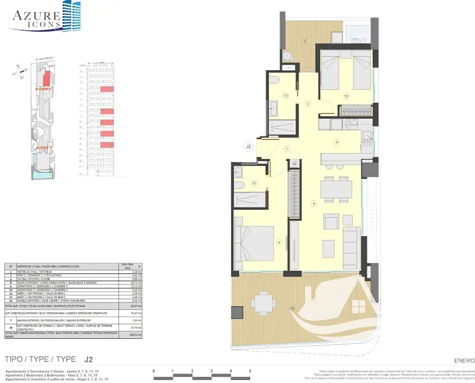 Apartmán o celkové ploše 109,32 m² a užitné ploše 74,47 m² je navržen s důrazem na světlo, otevřenost a funkčnost. Hlavní obytný prostor s kuchyní tvoří přirozené centrum bytu a plynule navazuje na terasu o velikosti 27,70 m². Druhý venkovní prostor v podobě balkonu o rozloze 7,15 m² doplňuje celkový komfort a přináší další perspektivu výhledu. Jedna terasa směřuje k moři a ikonické skále Peñón de Ifach, druhá nabízí klidný pohled na solné laguny, což vytváří ideální kombinaci energie i klidu. Dvě ložnice poskytují dostatek soukromí a moderní koupelna je řešena prakticky i elegantně. Součástí je také sklep a vlastní parkovací místo.