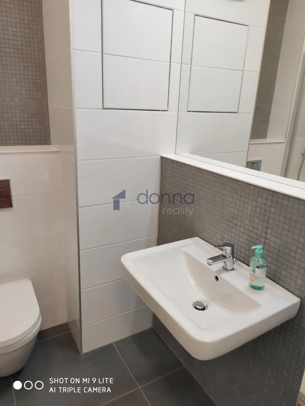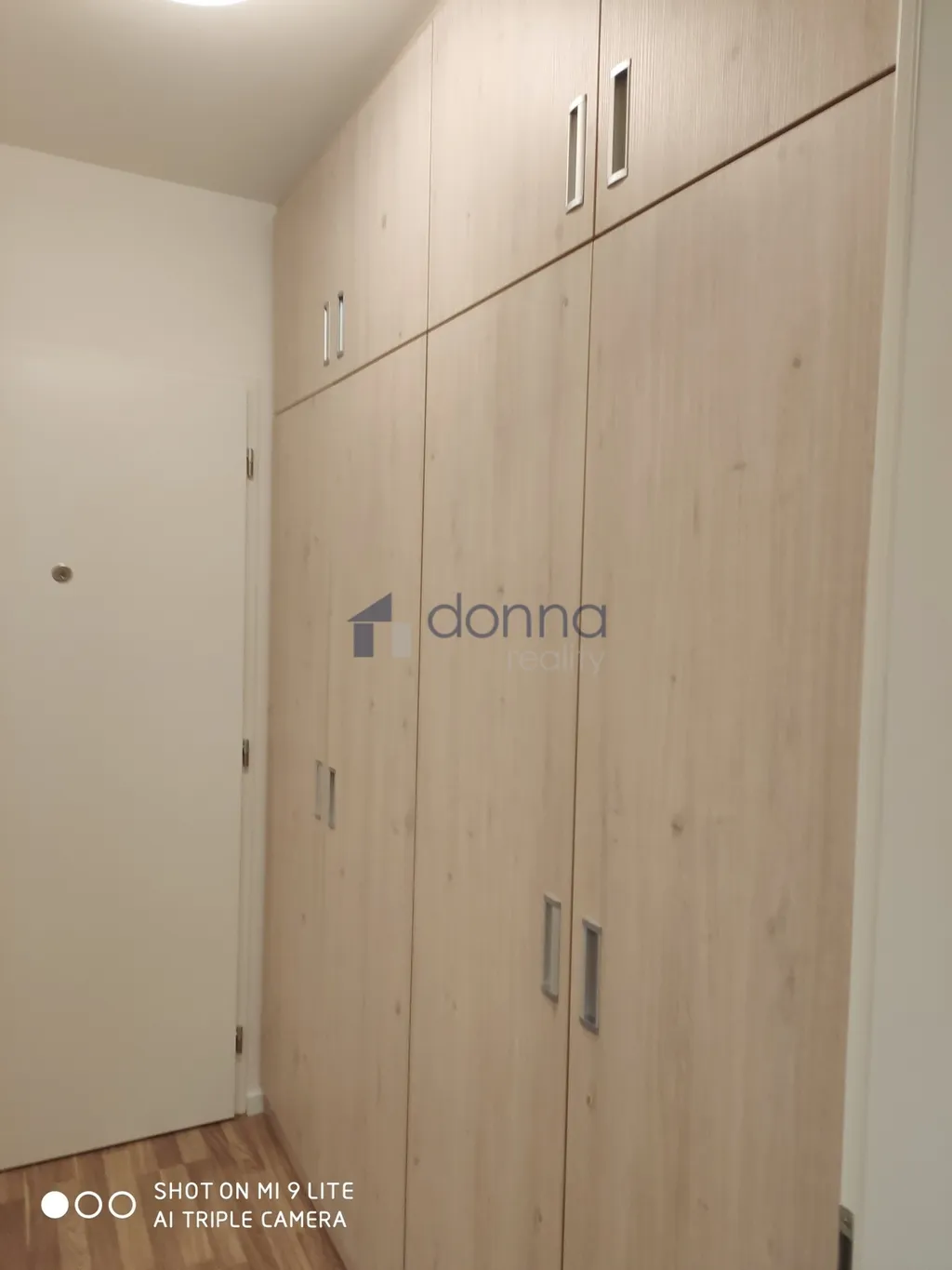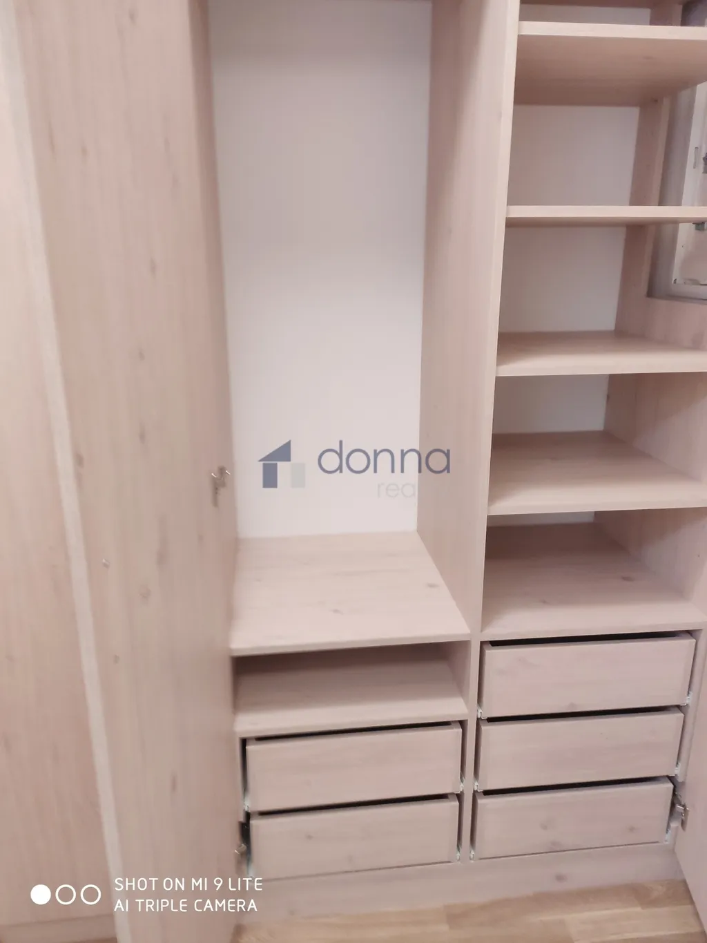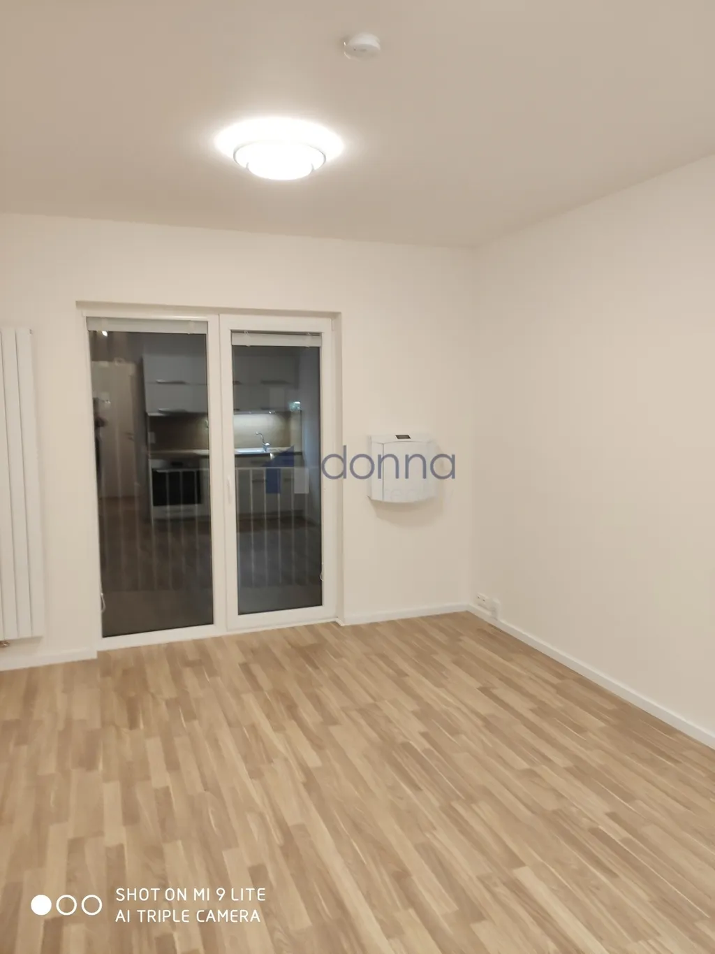 Částečně zařízený moderní byt: předsíň s velkou šatní skříní, obývací pokoj s kuchyňským koutem a vstupem na balkon, koupelna se sprchovým koutem a toaletou. Kuchyňská linka se spotřebiči (varná deska, el. trouba, odsavač par, lednice), jídelní stůl a 2 židle.