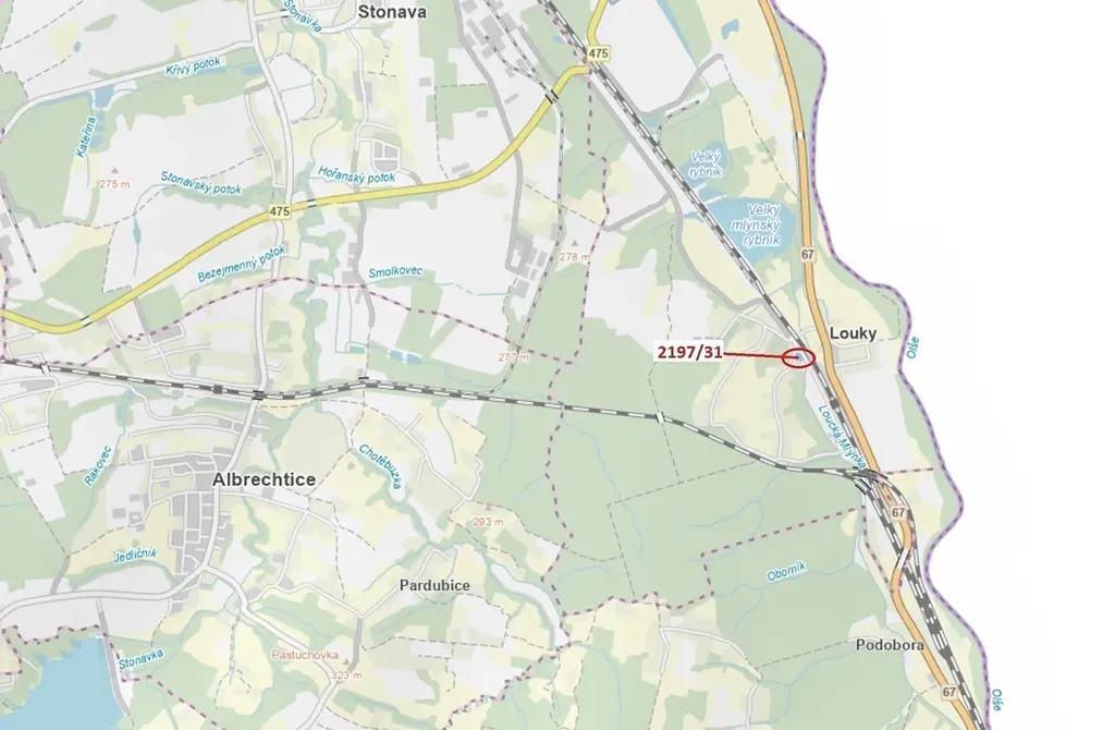 Lesní pozemek o výměře 1999 m2, parcelní číslo 2197/31, podíl 1/1, katastrální území Louky nad Olší, obec Karviná, obec s rozšířenou působností Karviná, okres Karviná, Moravskoslezský kraj.