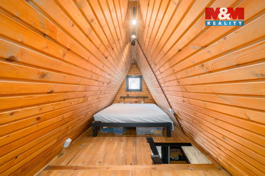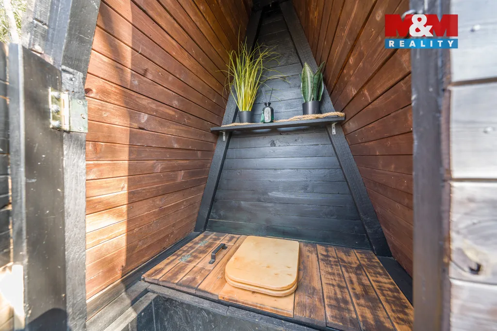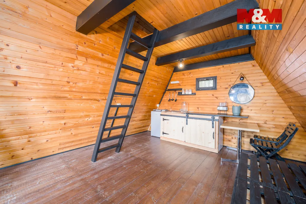 Nabídkou je zrekonstruovaná dřevěná rekreační chata se zastavěnou plochou 15 m² a se zahradou s výměrou pozemku 353 m².