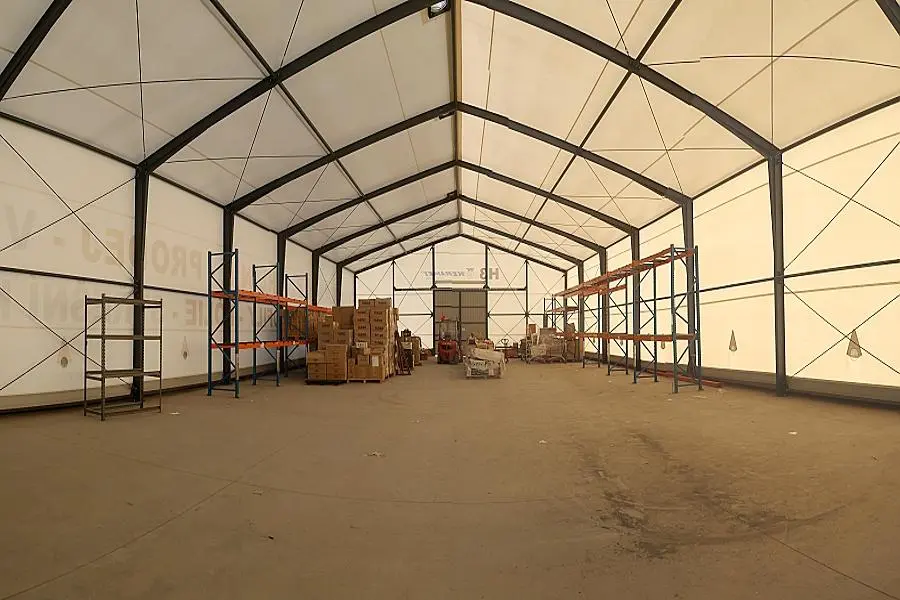 Aktuálně k dispozici volná skladová hala - nepromokavý textilní/plastový materiál. Do haly vedou nákladní vrata pro Destu a nákladní auto + boční menší vstup. Hala je vedená jako sklad nehořlavých průmyslových komodit a věcí. Výška 4,8 až 5,5 m. K hale přináleží 50 m2 zázemí - aktuálně se opravuje. WC, voda, Internet. Manipulační asfaltová plocha před halou - 250 m2.