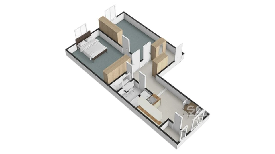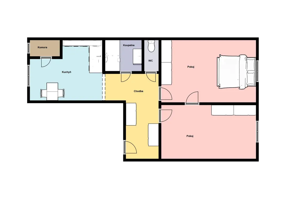 Ze vstupní chodby je přístup do obou neprůchozích pokojů. Kuchyně s kuchyňskou linkou je také samostatná.