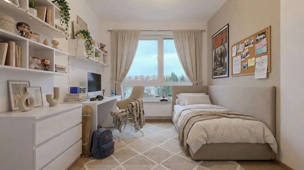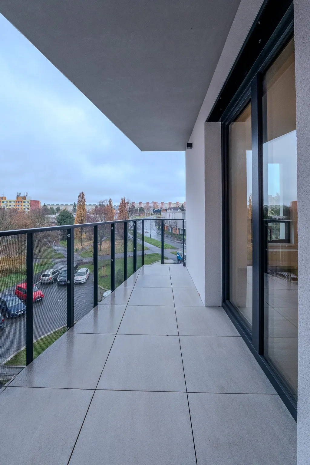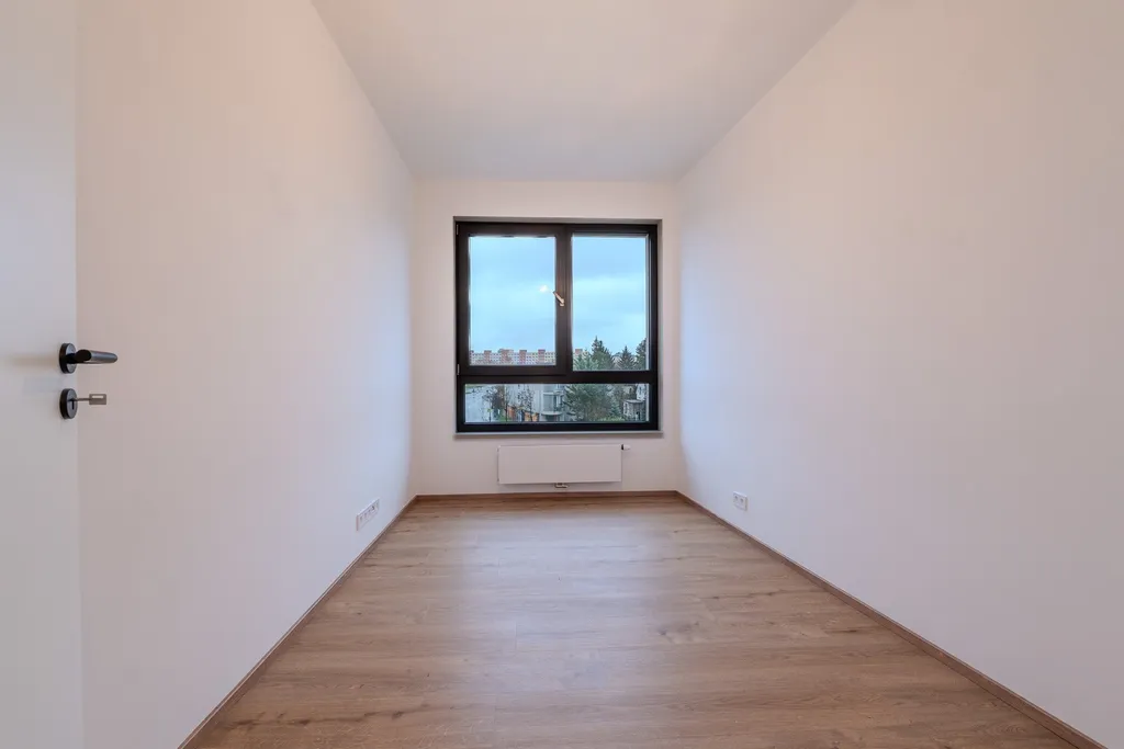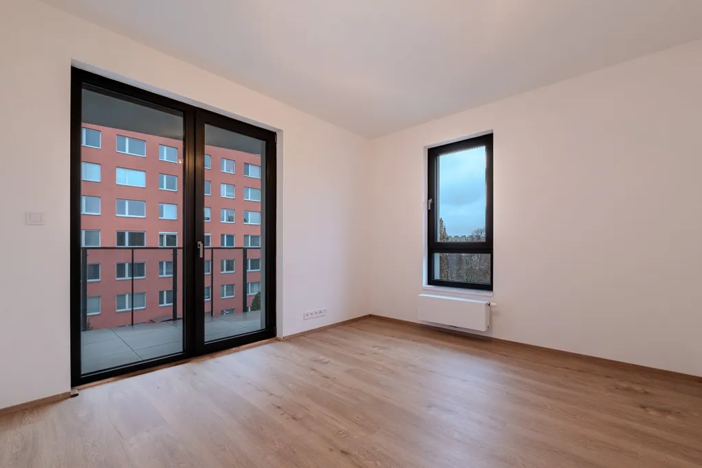 Nový byt 3+kk s terasou (5,8 m2) se nachází se 4. NP. Byt disponuje obývacím pokojem s kuchyňským koutem (příprava na kuchyň), dvěma ložnicemi, koupelnou a oddělenou toaletou. Je vybaven moderními a kvalitními materiály: vinylové podlahy, velkoformátová okna s izolačními trojskly, podlahové vytápění v koupelně. Součástí jsou také přípravy pro venkovní stínění a chytré ovládání domácnosti. Byt má k dispozici sklepní kóji (5,7 m2) a garážové stání, které je nutné dokoupit za cenu 700 tisíc korun českých.
