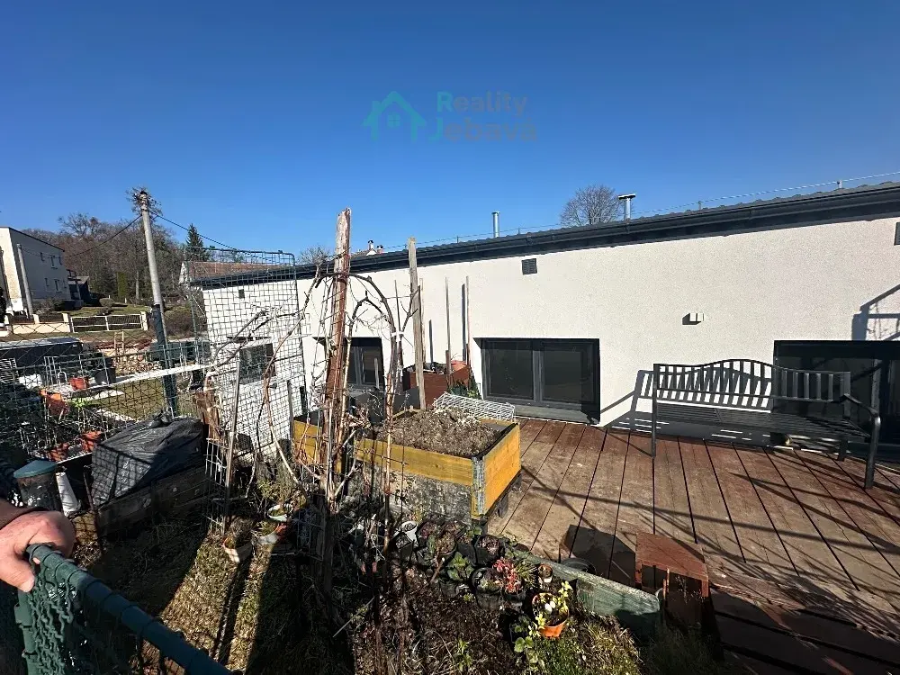 Za domem se nachází dřevěná terasa, která slouží jako klidná odpočinková zóna. Je zde umístěné venkovní posezení a také záhony pro pěstování květin, bylinek či drobné zeleniny. Přímo za domem se navíc nachází rybník, který dotváří příjemnou atmosféru a přispívá k poklidnému venkovskému charakteru bydlení.