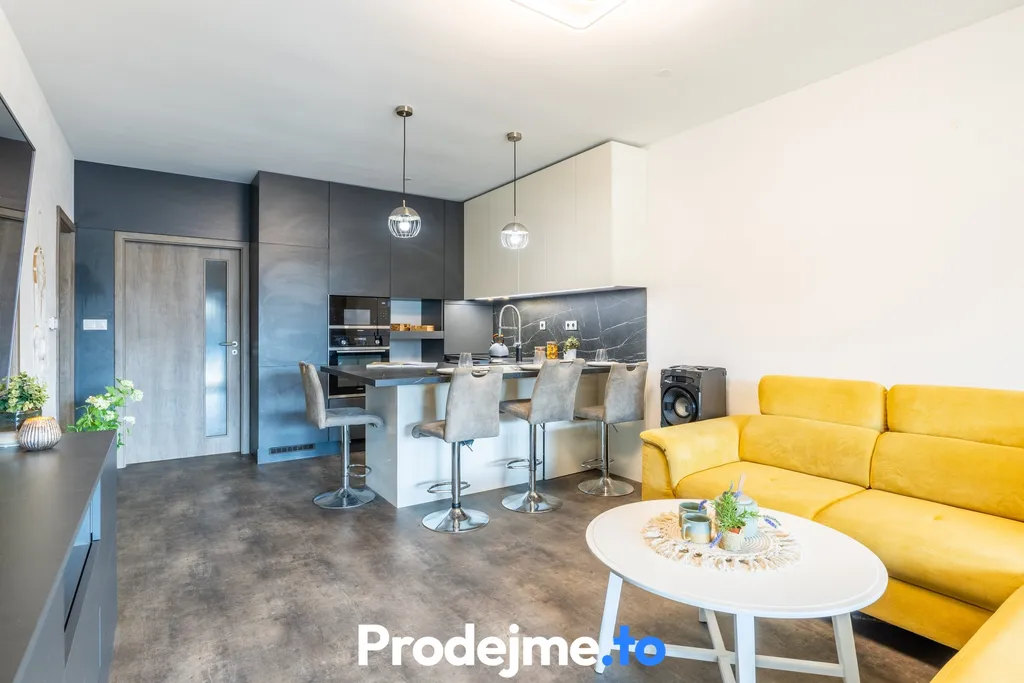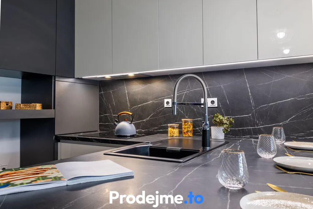 Dispozici dominuje otevřený obývací prostor s kuchyňským koutem (31,7 m²), ze kterého projdete rovnou na terasu o velikosti 13,8 m². Krásná kuchyňská linka do tvaru L je osazená kvalitními vestavěnými spotřebiči Siemens (trouba, mikrovlnka, indukční deska). Praktický ostrůvek tu chytře slouží jako plnohodnotné jídelní posezení.