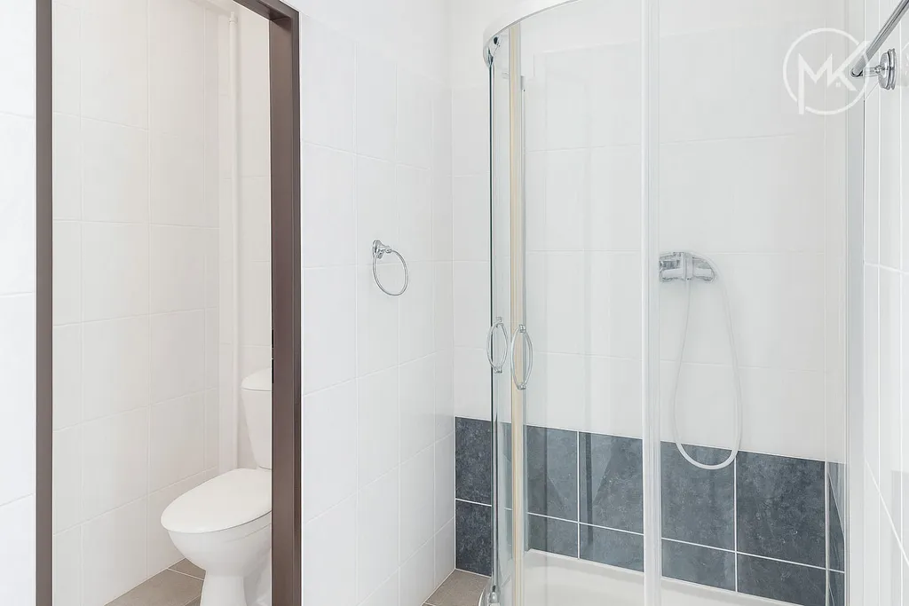 Koupelna s moderním sprchovým koutem a oddělené WC