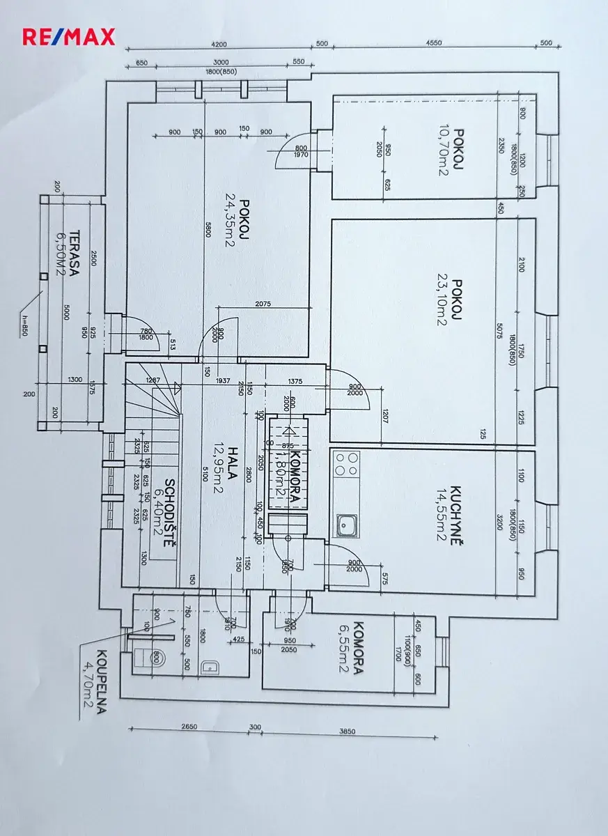 Pokoje jsou o velikosti cca 24,35m2, 23,10m2, 10,70 m2 + kuchyně 14,55m2 + hala 12,95m2+ koupelna s toaletou 4,70m2 (+ dvě šatny).