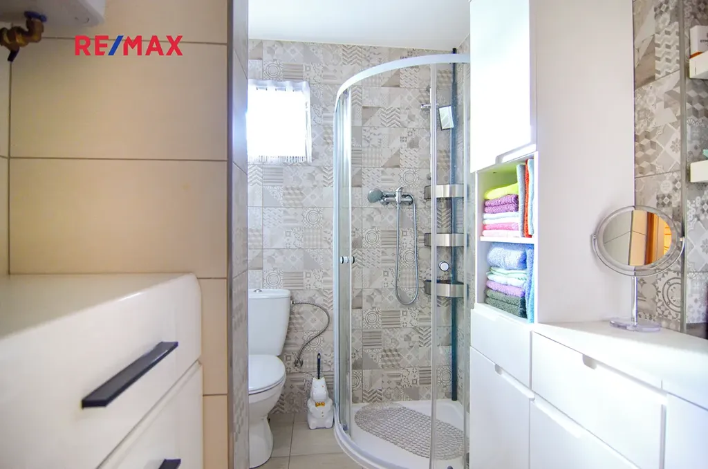 V přízemí najdeme kuchyni, jídelnu a pokoj. Dále koupelnu se sprchovým koutem a společnou toaletou.