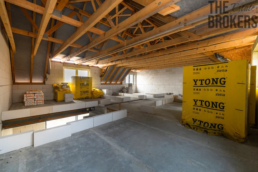 Podkroví: dle projektové dokumentace je navržena chodba se schodištěm (15,07 m²), čtyři pokoje (17,93 m², 13,03 m², 12,51 m² a 11,01 m²) a sociální zázemí (koupelna, samostatné WC a šatna), podkroví není příčkami rozdělené. Uspořádání místností a rozmístění příček lze zvolit podle přání kupujícího.
