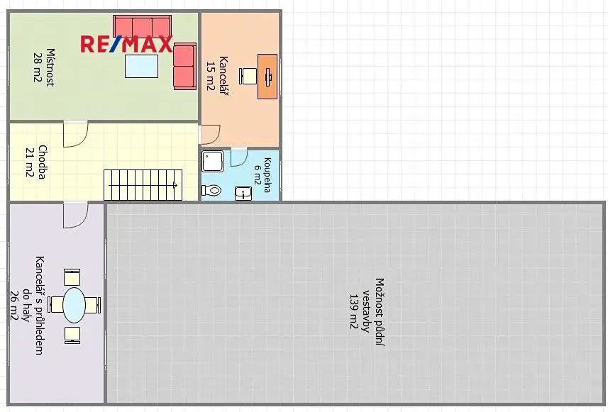 - 2.NP - chodba, kancelář s průhledem do haly 26 m2, kancelář se sprchou a toaletou 15 m2, místnost 28 m2,