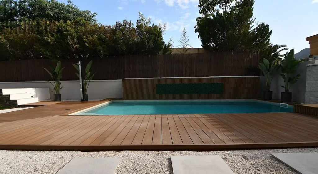 Venkovní oáza s nádherným bazénem s porcelánovými dlaždicemi, vodopádem, krytou terasou s kompletní kuchyní a ohništěm.