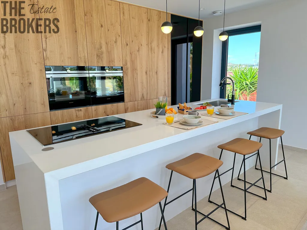 Kuchyně: Vysoce kvalitní kuchyně v otevřeném plánu s pracovními deskami "Silestone" a integrovanými spotřebiči, včetně trouby, varné desky, lednice/mrazničky a mikrovlnné trouby. Samostatný prostor pro pračku, sušičku a boiler na teplou vodu.