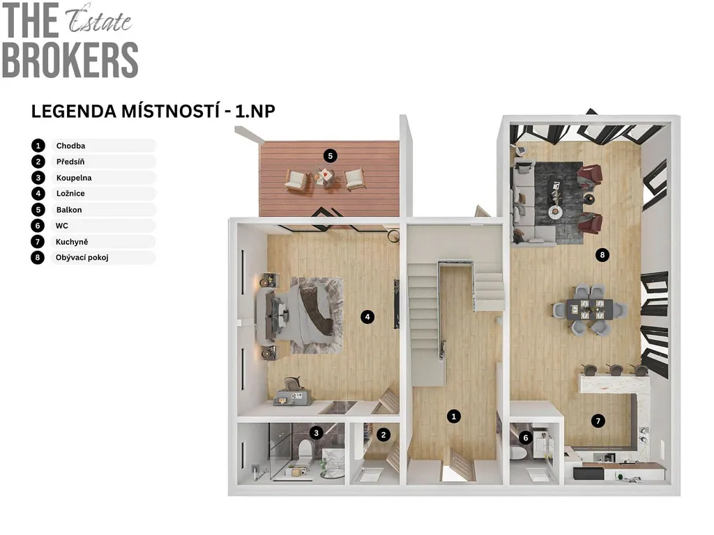 V prvním podlaží se nachází světlý obývací pokoj s panoramatickými okny, která propojují interiér se zahradou a umožňují vychutnávat si jedinečné výhledy a atmosféru tropického ostrova. Součástí obývacího prostoru je také moderní kuchyňský kout s barem a jídelním stolem, ideální pro společné chvíle. Nechybí ani technická místnost, samostatná toaleta s umyvadlem a pračkou se sušičkou. Dům je vybaven kamerovým systémem.