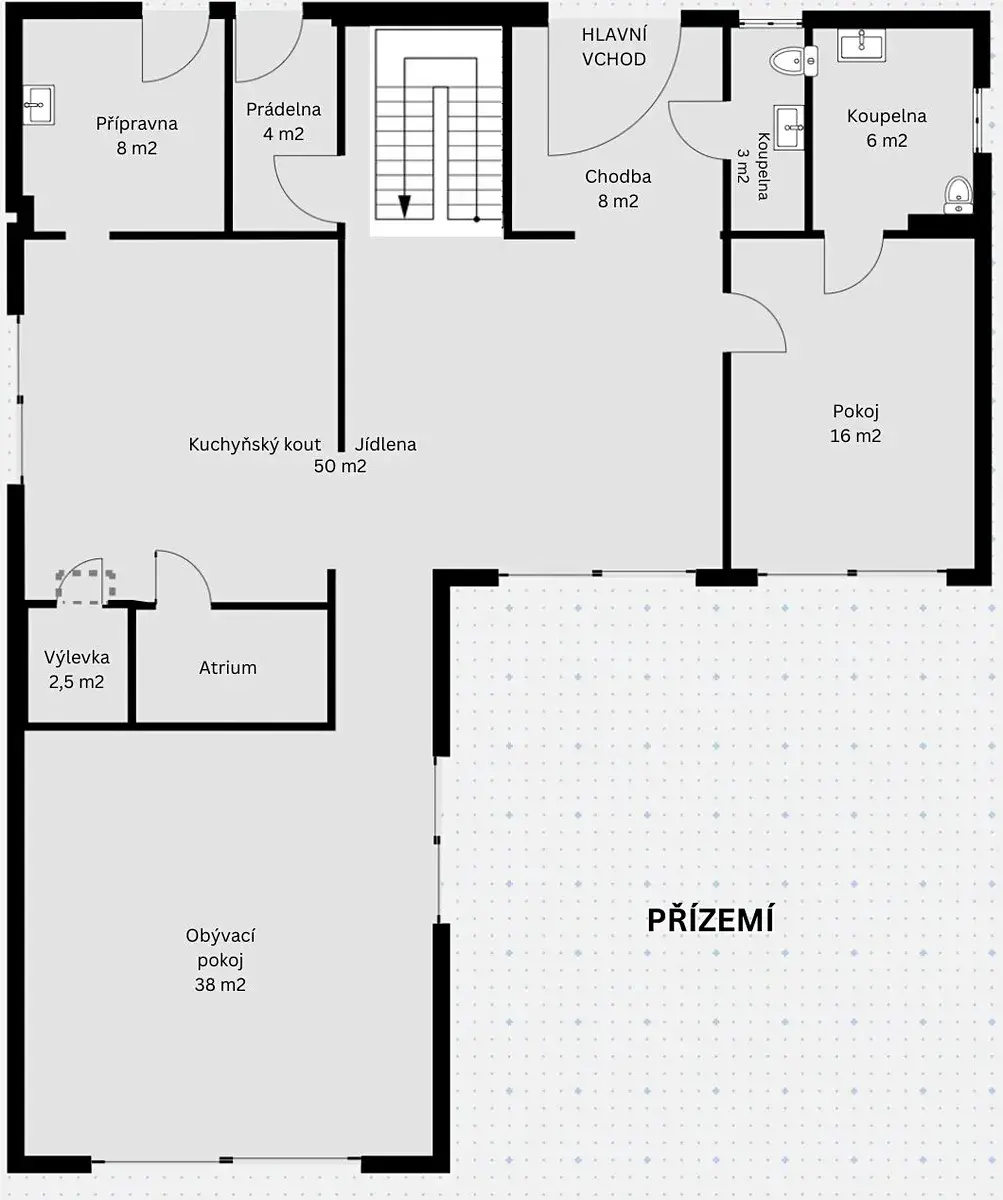 • Přízemí: světlý a prostorný obývací pokoj s kuchyňským koutem ke kterému náleží přípravna, samostatný pokoj, dvě koupelny, a technická místnost s prádelnou.