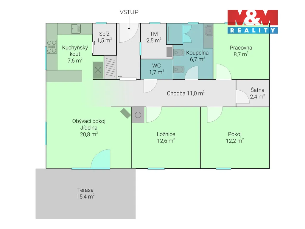 Světlý interiér a moderní provedení splňují požadavky současného bydlení - v domě naleznete krásné vysoké trámové stropy, automatická střešní okna a moderně vybavenou kuchyň. V domě je podlahové topení, klimatizace a krbová kamna. K domu náleží jižní terasa a samostatné parkovací stání na vlastním pozemku.