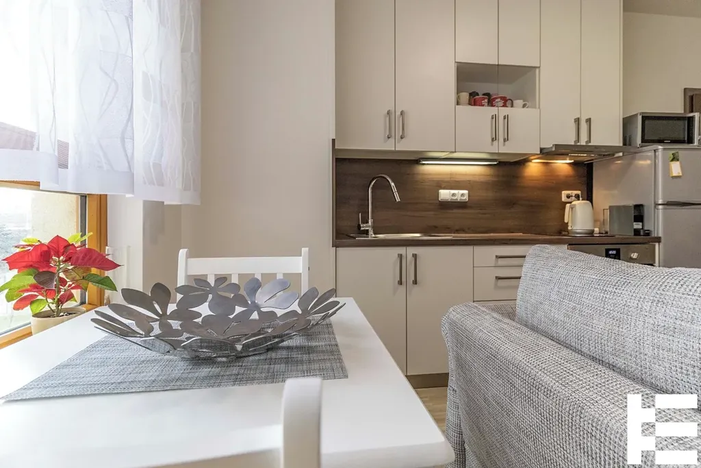 Byt je kompletně zařízen moderním nábytkem a kompletně vybaven. V předsíni je dostatek úložného prostoru stejně tak v obývacím pokoji, kde je prostorná šatní skříň.