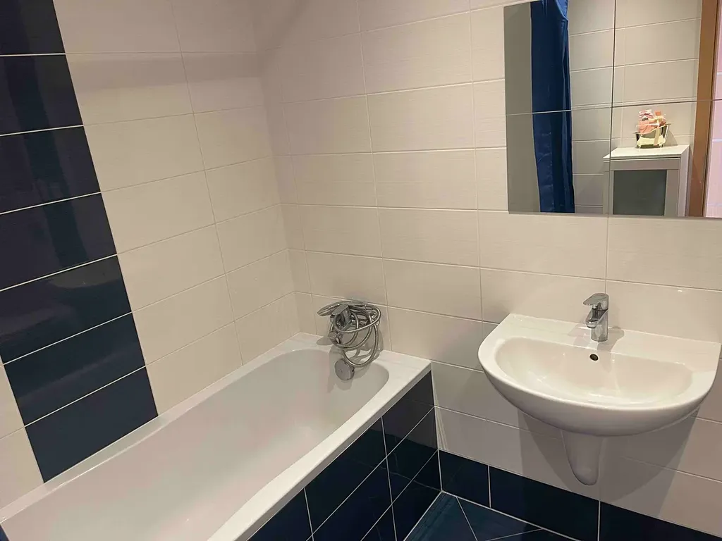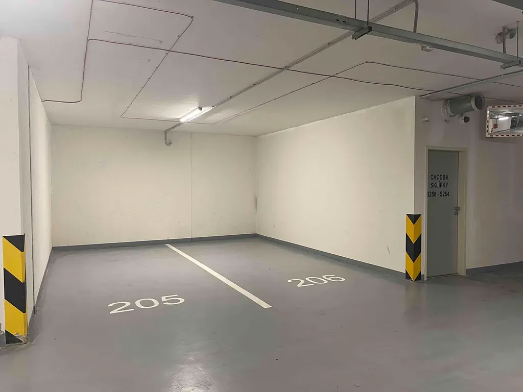 Koupelna je vybavena vanou, pračkou a topným žebříkem na ručníky. Součástí pronájmu je garážové stání v podzemní garáži (-3. podlaží).