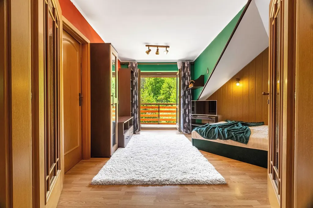 V podkroví se nachází dalších 127 m² obytné plochy, celkem zde naleznete 4 ložnice, jednu s balkonem orientovaným do zahrady. Celkově tedy dům nabízí 5 ložnic, z nichž jedna je v přízemí.