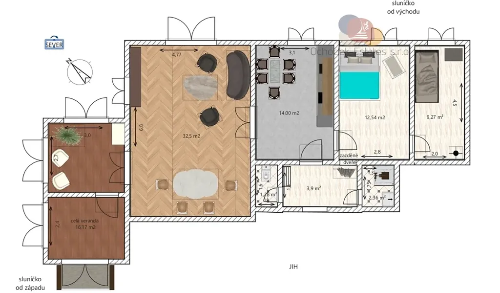 Nejkrásnější je tu velká veranda se vstupem na zahrádku. Osobně bych ještě zrušil dostavenou tenkou příčku rozdělující verandu na relaxační a skladovací část. Využijte plný potenciál! Sekačka může přece parkovat třeba ve sklepe a na motyčku s truhlíkem bude stačit hezká komoda. Zahrádka už si zaslouží trochu péče. Troufnete si na to?