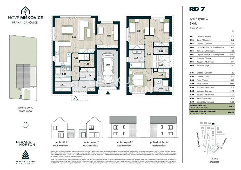 Nabízíme k prodeji prostorný rodinný dům o dispozici 5+kk v rezidenčním projektu Nové Miškovice, který vyniká velkorysou užitnou plochou 159,71 m² a vlastním pozemkem o velikosti 379,82 m². Dispozice domu je navržena s důrazem na pohodlný rodinný život, dostatek soukromí a přirozené propojení interiéru se zahradou.