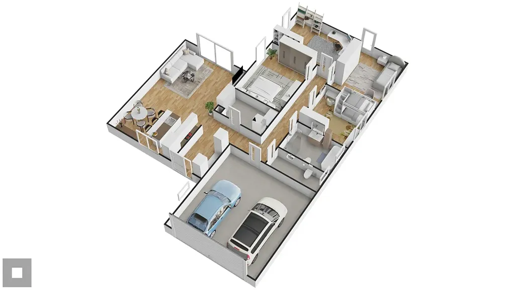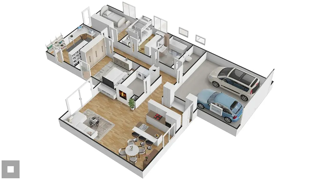 Čtyři samostatné pokoje poskytují dostatek soukromí pro rodiče i děti, případně možnost pracovny či fitness. Dům disponuje dvěma koupelnami (koupelna s toaletou, toaleta), technickou místností a přímým vstupem z domu do garáže, což výrazně zvyšuje komfort každodenního užívání.