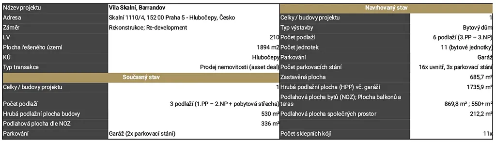 Dům je ideální pro rekonstrukci či náhradu jinou stavbou zapadající do okolního charakteru. Může být nahrazena jednou rodinnou vilou, případně rodinným dvoj domem až o čtyřech NP a jedním PP. Celková výměra HPP pro novou stavbu může dosahovat až 1000 - 1200m2.