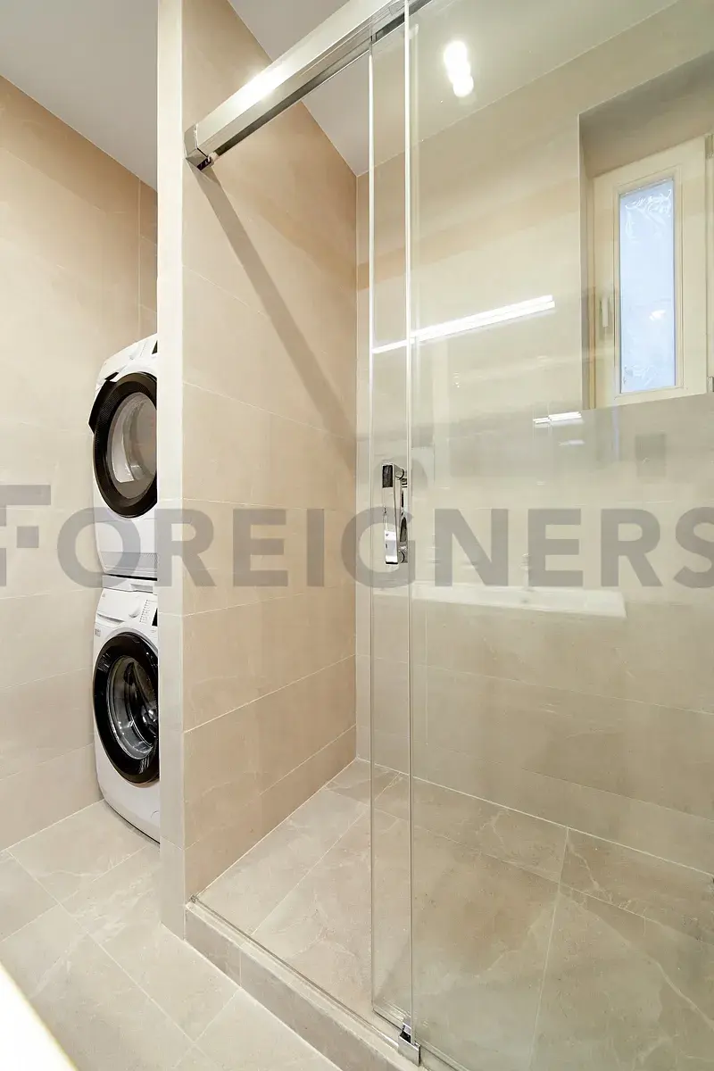 Koupelna nabízí komfort v podobě dvou umyvadel, prostorného sprchového koutu, pračky a sušičky. Toaleta je oddělená.