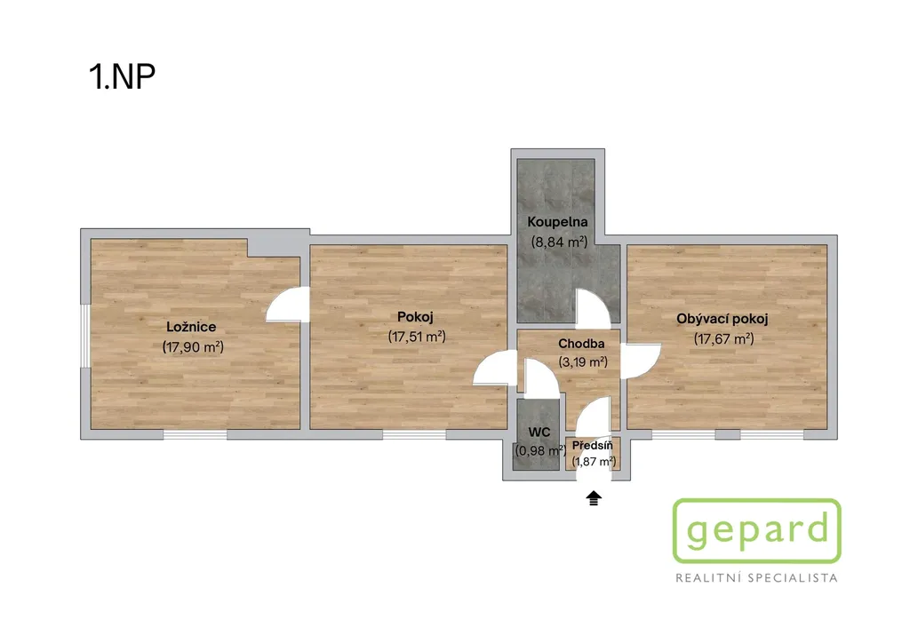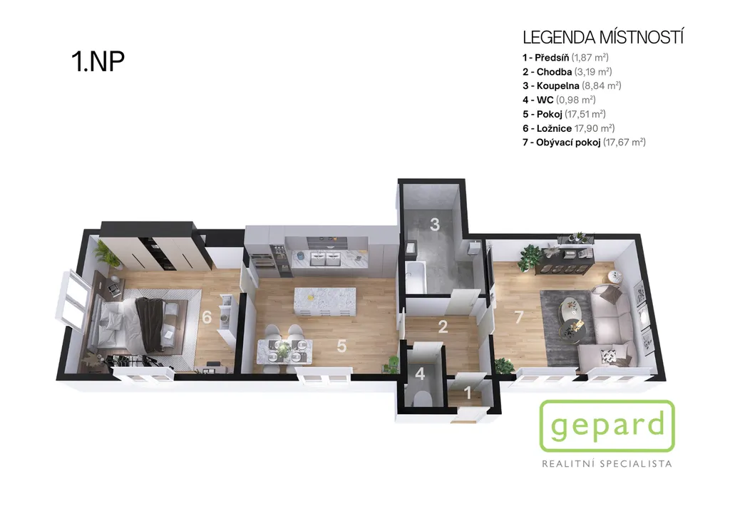 Stavba je rozdělena na dvě plnohodnotné a provozně oddělené bytové jednotky. V prvním nadzemním podlaží se nachází bytová jednotka o dispozici 2+1 s podlahovou plochou 68 m². Ve druhém a třetím nadzemním podlaží je umístěn prostorný mezonetový byt o dispozici 4+kk s výměrou 134 m². Celková užitná plocha činí 201,87 m², zastavěná plocha dosahuje 97,9 m² a celková výměra pozemku je 154 m². Dispoziční řešení umožňuje plnohodnotné soužití více generací pod jednou střechou, případně kombinaci vlastního bydlení a pronájmu.