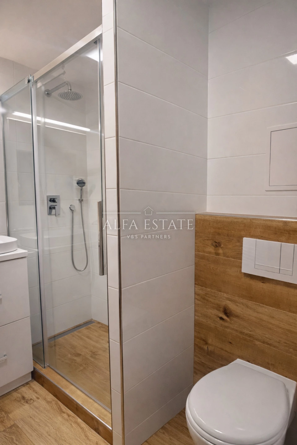Interiér tvoří prostorná vstupní hala s vestavěnými úložnými prvky, elegantní koupelna se sprchovým koutem, designový kuchyňský kout s kuchyňskou linkou na míru značky Gorenje a kvalitními spotřebiči, plynule propojený s jídelní částí a světlým obývacím prostorem. Za obývacím pokojem se nachází klidová ložnice. Na opačné straně bytu je umístěna druhá prostorná ložnice s přímým vstupem na lodžii, odkud se otevírá úchvatný výhled na Karlovy Vary — ideální místo pro ranní kávu i večerní relaxaci.
