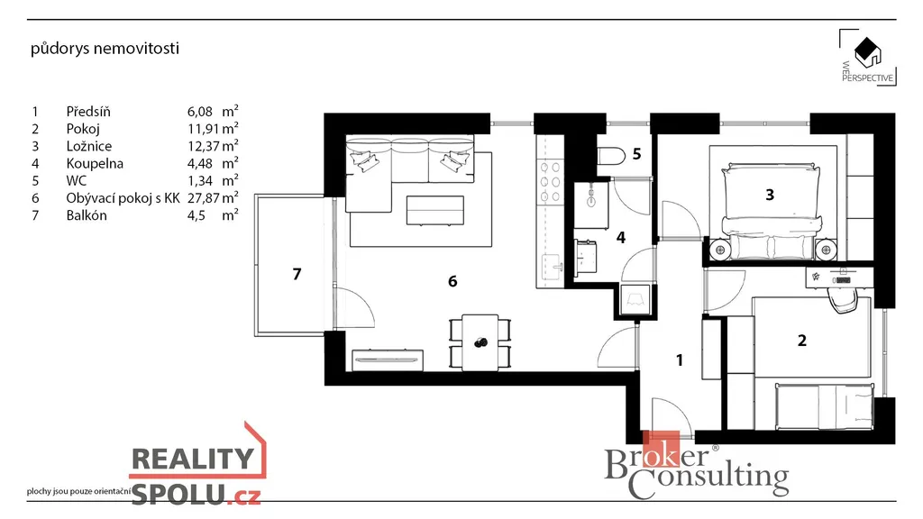 Byt tvoří prostorná chodba, 2 samostatné neprůchozí pokoje, koupelna, WC, obývací pokoj s kuchyňským koutem a balkón.