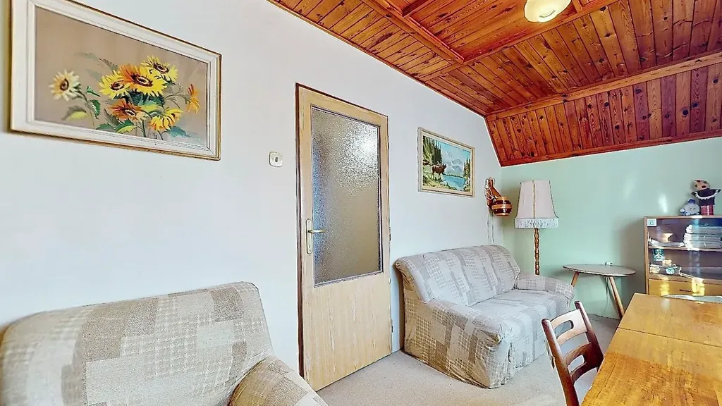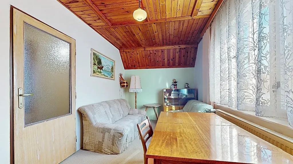 Ve druhém patře jsou další dva pokoje (ložnice a dětský pokoj), dále navazující půdní prostor, který nabízí možnost rozšíření místností a poslední patro je již otevřená půda.