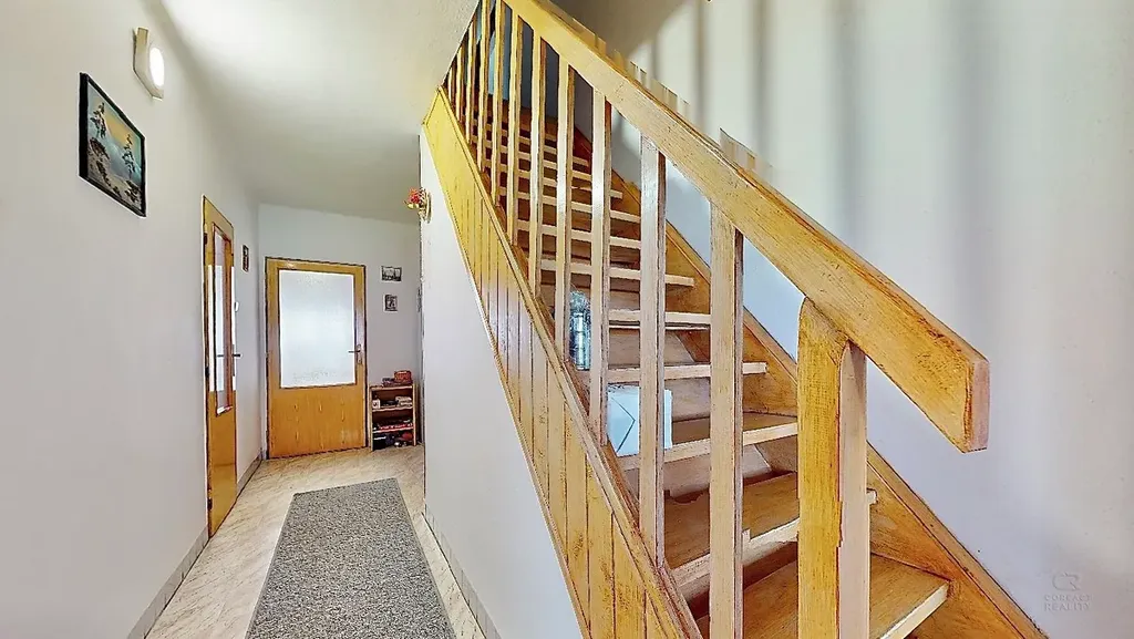 V prvním patře se nachází dispozice 2+1 s prostornou chodbou, koupelnou, samostatnou toaletou, spižírnou v kuchyni a s komorou na chodbě. Z chodby se navíc ještě vchází na uzavřenou terasu s hlavním vchodem do domu.