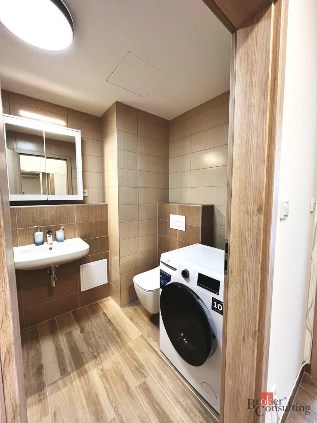 Byt se pronajímá částečně vybavený – k dispozici je kuchyňský kout, vestavěná skříň v chodbě, volně stojící skříň v obytné místnosti, lednice a pračka. Ostatní vybavení si můžete zařídit podle vlastního vkusu a potřeb. Ze suterénu domu, kde se nachází garážové stání, se pohodlně dostanete výtahem až k bytu.