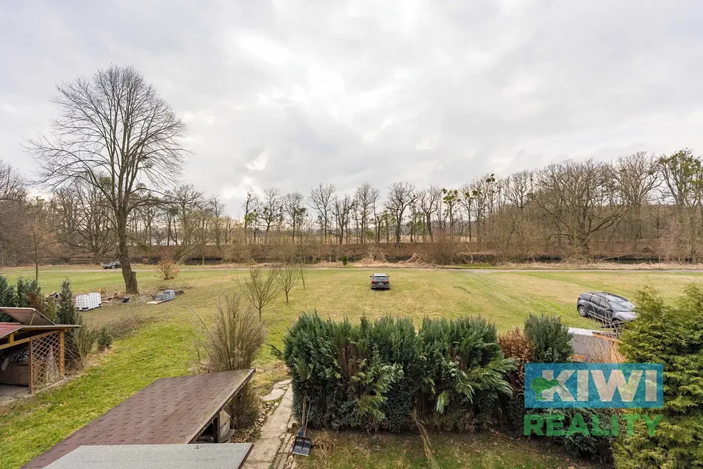 Do horního patra vedou skládací schody. Tento prostor je vhodný jako ložnice či odpočinková zóna a nabízí příjemný výhled na řeku Opavu, který podtrhuje rekreační charakter nemovitosti.