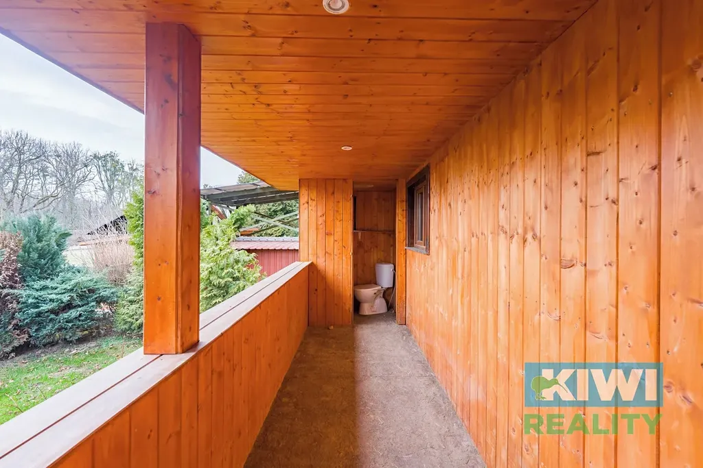 Před vstupem do chaty vás přivítá prostorná nově vybudovaná terasa, která se táhne podél celé přední části stavby. Nabízí dostatek místa pro posezení s rodinou či přáteli a na jejím konci se nachází prakticky řešený WC koutek.