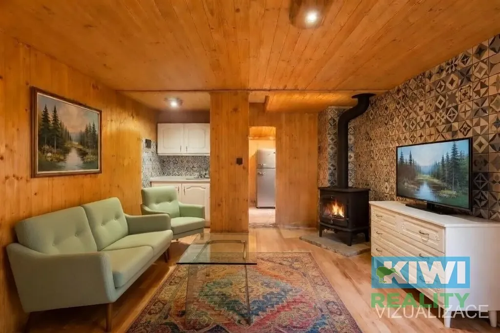 V přízemí se nachází vstupní chodba, kterou lze využít jako šatnu s úložným prostorem, a dále prostorná místnost, která může sloužit jako obývací pokoj s kuchyňským koutem. V rohu místnosti je připravena instalace pro krbová kamna – stačí doplnit kamna dle vlastního výběru a vytvořit si zde hřejivou atmosféru pro chladnější večery.
