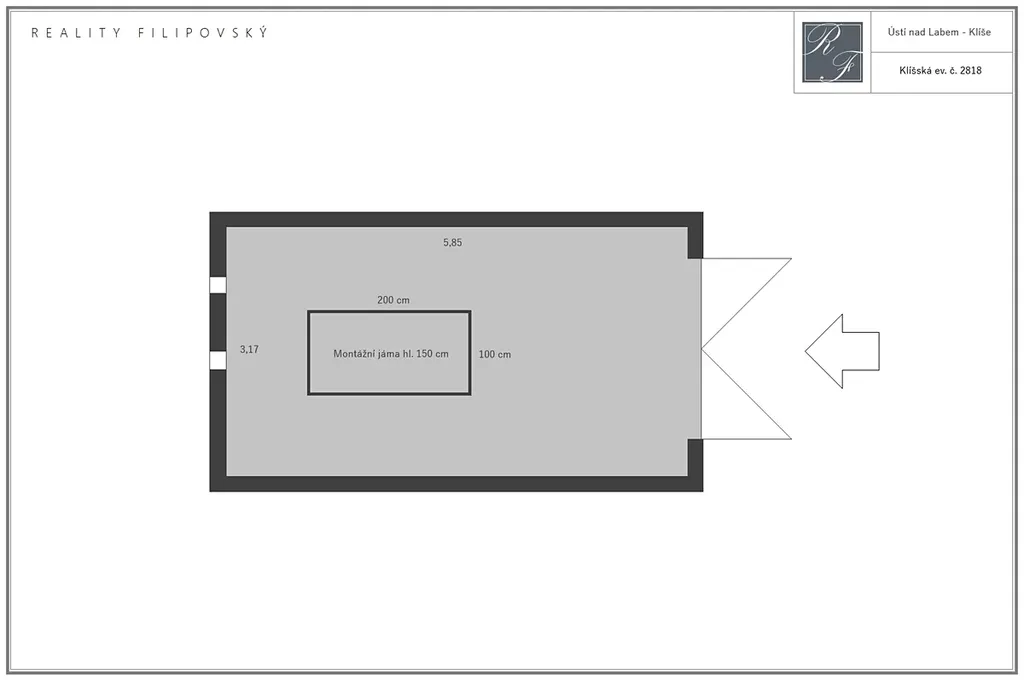 Garáž se nachází v části Ústí nad Labem – centrum, je ve velmi dobrém stavu s připojením na elektřinu a disponuje plnohodnotnou montážní jámou o rozměrech 2x1 metr a s hloubkou 1,5 metru.
